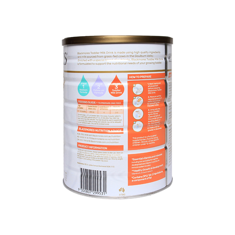 – Sữa Blackmores Toddler số 3 900g dành cho giai đoạn trên 1 tuổi – giai đoạn tăng cường khám phá và bắt đầu học hỏi mọi thứ xung quanh – mang đến công thức giúp trẻ phát triển về chiều cao, cân nặng, phát triển hệ miễn dịch và trí não tối ưu