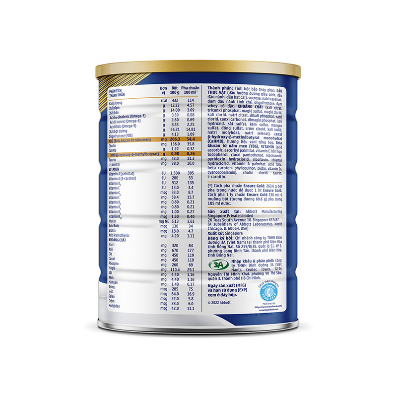 – Sữa Ensure Gold Vani 850g có thành phần dinh dưỡng bao gồm: Tinh bột bắp thuỷ phân, DẦU THỰC VẬT (dầu hướng dương giàu oleic, dầu đậu nành, dầu hạt cải), sucrose, natri caseinat, đạm đậu nành tinh chế, oligofructose, đạm whey cô đặc, KHOÁNG CHẤT (kali citrat, tricanxi phosphat, magiê sulfat, magiê clorid, kali clorid, natri citrat, dikali hydrophosphat, natri clorid, canxi carbonat, dimagiê phosphat, kali hydroxid, sắt sulfat, kẽm sulfat, mangan sulfat, đồng sulfat, crôm clorid, kali iodid, natri molybdat, natri selenat), canxi β-hydroxy-β-methylbutyrat monohydrat (CaHMB), hương vani tổng hợp, Beta Glucan từ nấm men (YBG), VITAMIN (acid ascorbic, ascorbyl palmitat, Vitamin E, hỗn hợp tocopherol, canxi pantothenat, niacinamid, pyridoxin hydroclorid, riboflavin, thiamin hydroclorid, Vitamin A palmitat, acid folic, beta caroten, phylloquinon, biotin, vitamin D3, cyanocobalamin), cholin clorid, taurin, L-carnitin.