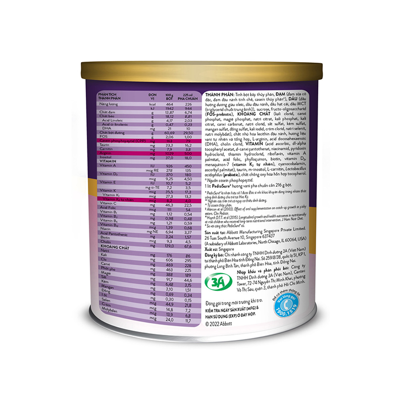 PediaSure có thành phần đa dạng các vitamin, khoáng chất giúp trẻ ăn ngon miệng hơn. Thành phần giàu đạm, hệ chất béo đặc biệt có MCT (chất béo dễ hấp thu) và hỗn hợp 3 loại dầu thực vật không chứa dầu cọ giúp trẻ dễ dàng hấp thu và giải phóng năng lượng nhanh. Qua đó, giúp trẻ tăng cân khỏe mạnh. Sản phẩm được chứng minh lâm sàng mang lại hiệu quả tăng 2.2kg sau 48 tuần.